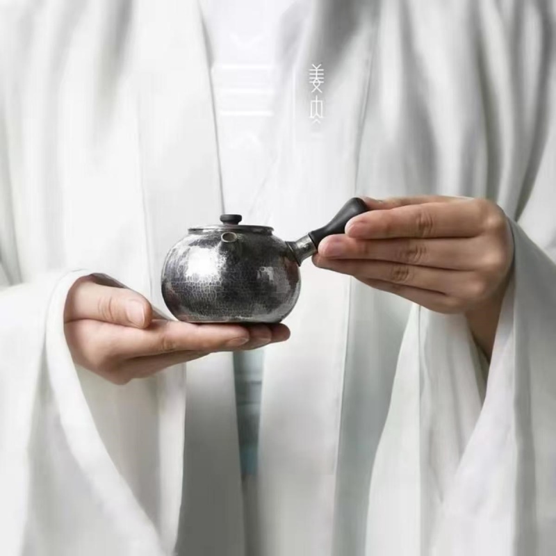 The minimalist lid, topped with a small knob, integrates seamlessly with the overall silhouette. The short, straight spout ensures a precise and steady pour, making it perfectly suited for the small-volume boiling needs of a Gongfu tea ceremony. Boiling water in silver is known to soften its quality, resulting in a mellower, smoother tea broth.