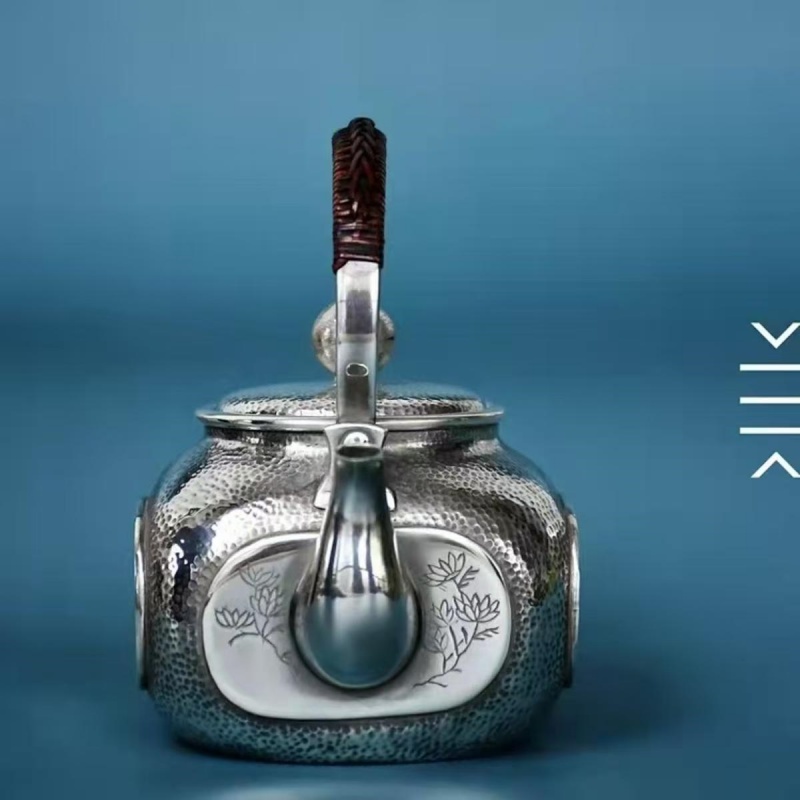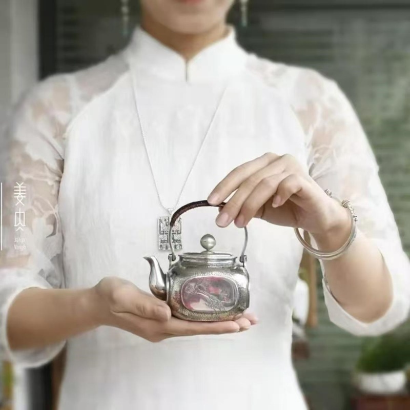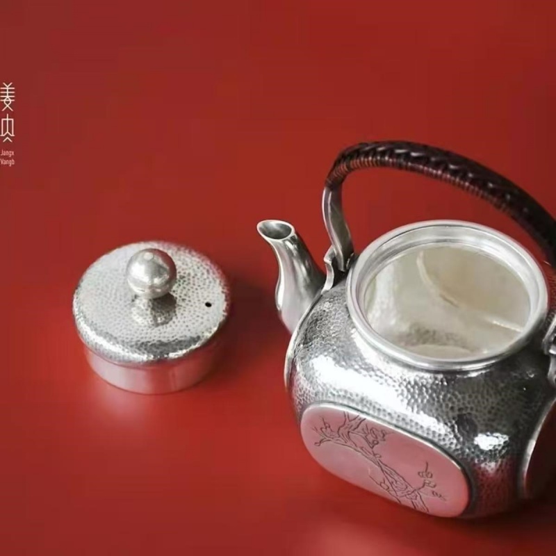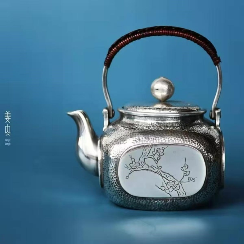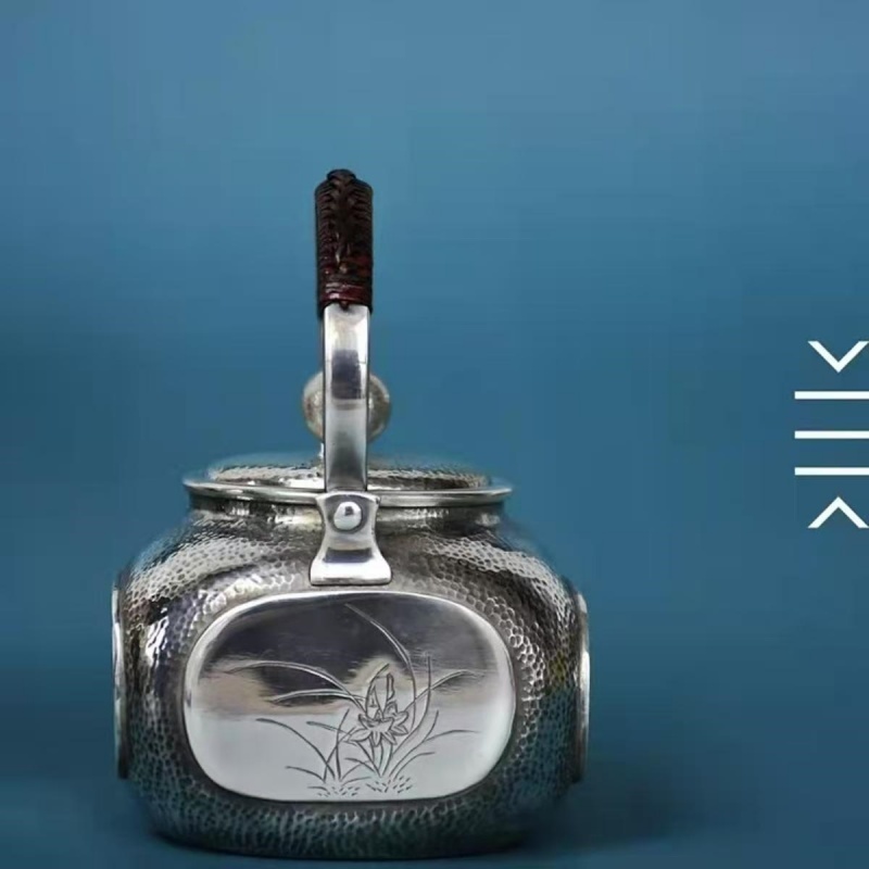Name: Palm-sized Swing Handle Pure Silver Teapot – Four Noble Plants