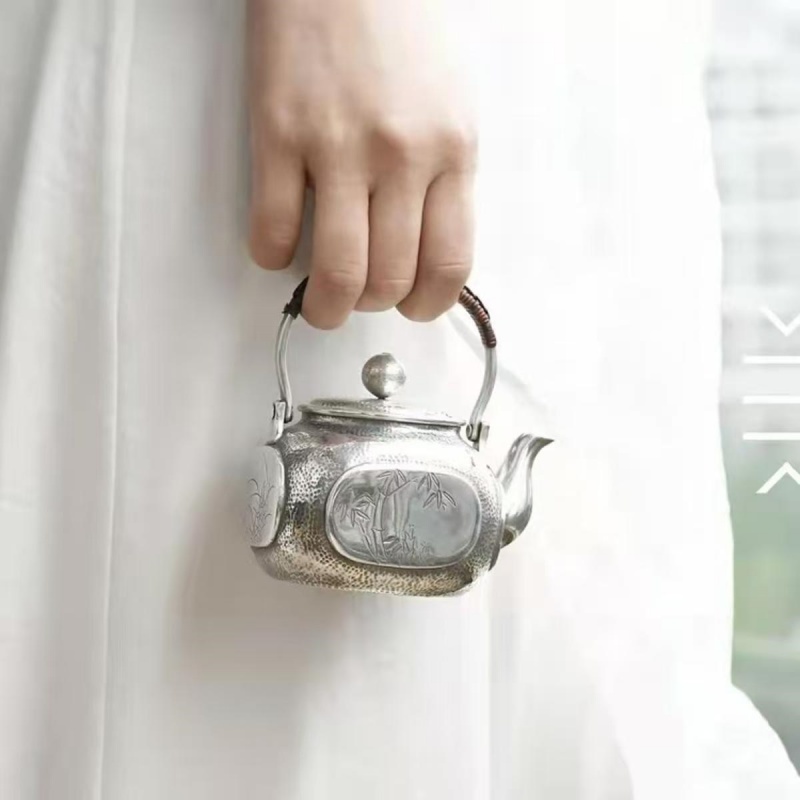 Four Noble Plants | A Palm-sized Swing Handle Pure Silver Teapot