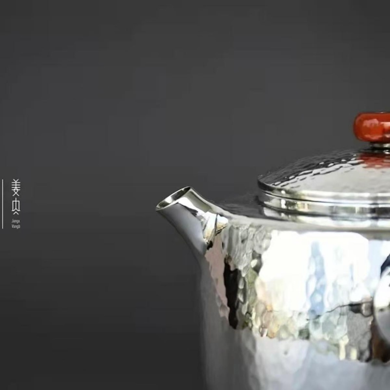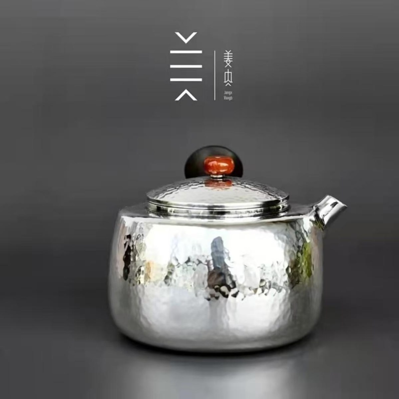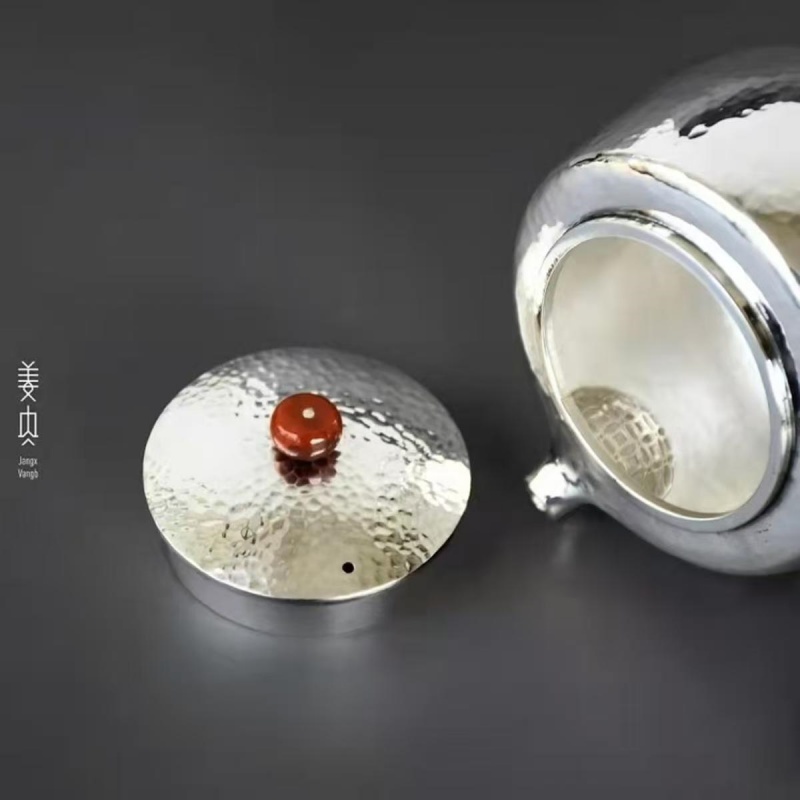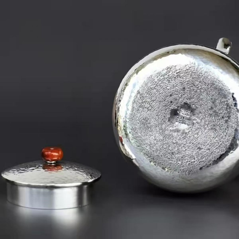 This pure silver side-handle teapot is hand-hammered from solid silver, featuring a naturally textured surface with crisp, refined hammer marks and a gentle, lustrous sheen.